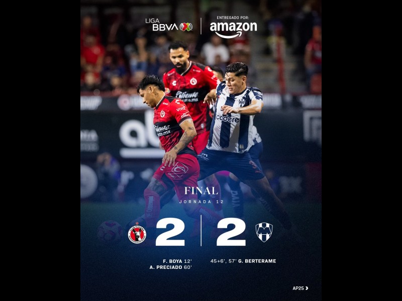 (Latinus) Xolos y Rayados empataron 2-2 este domingo en el partido que cerró la Jornada 12 del Apertura 2025 de la Liga MX, disputado en el Estadio Caliente.